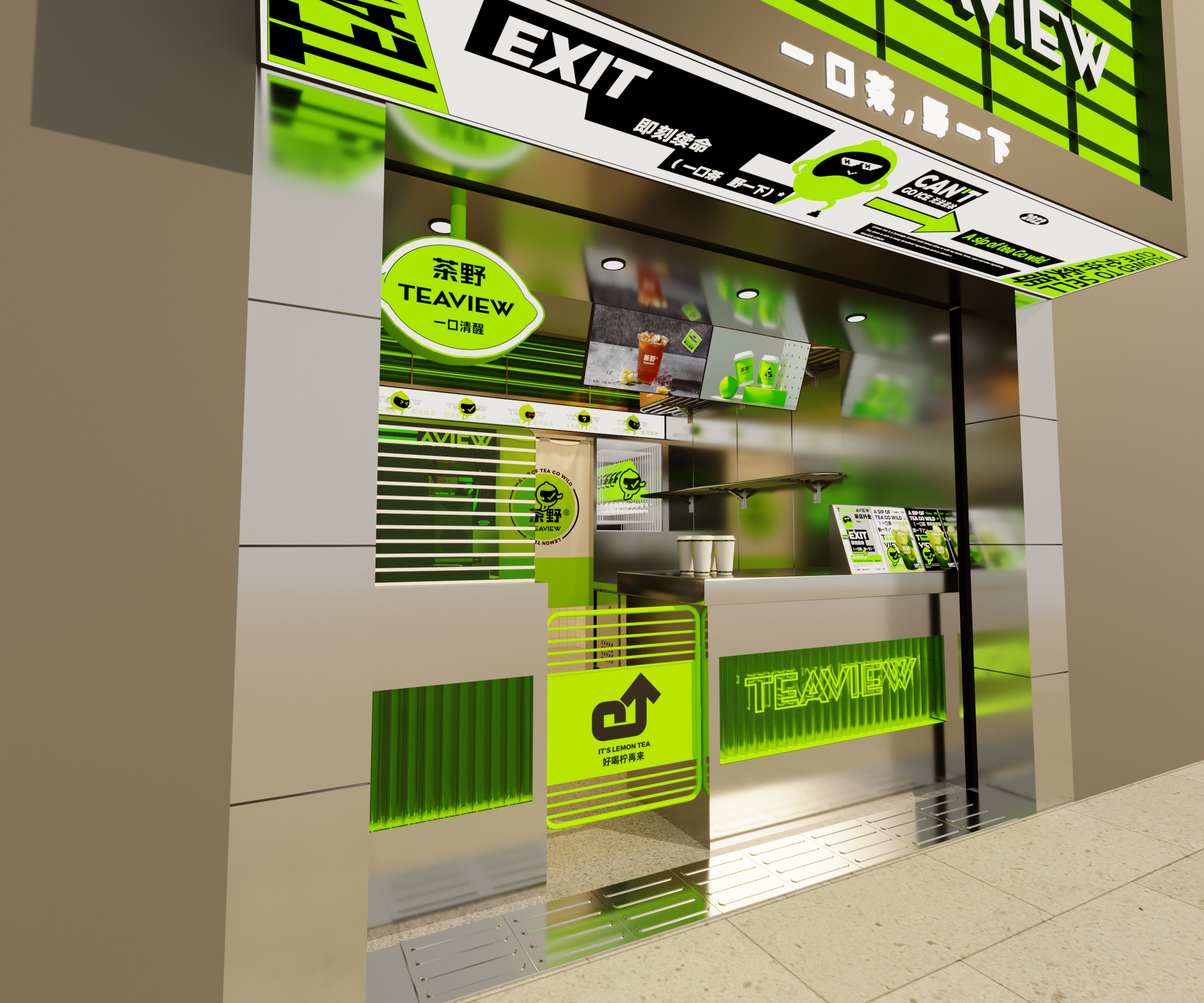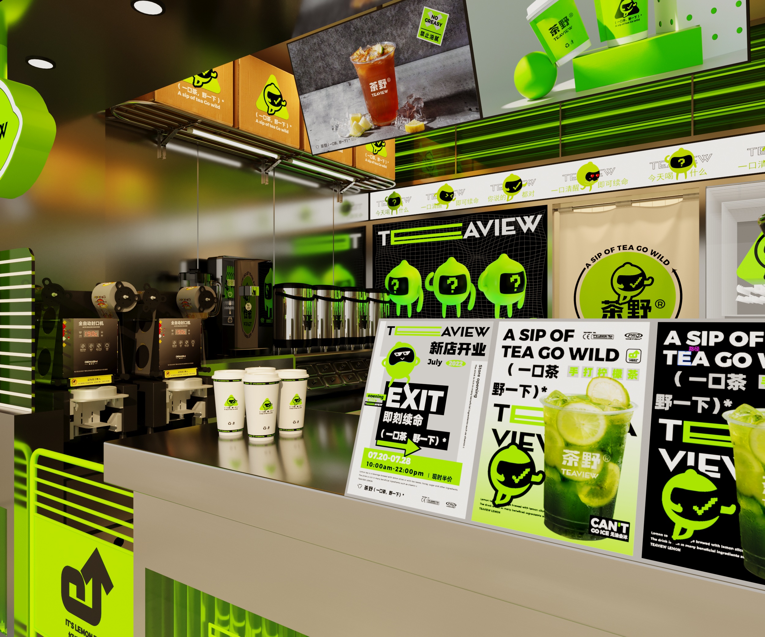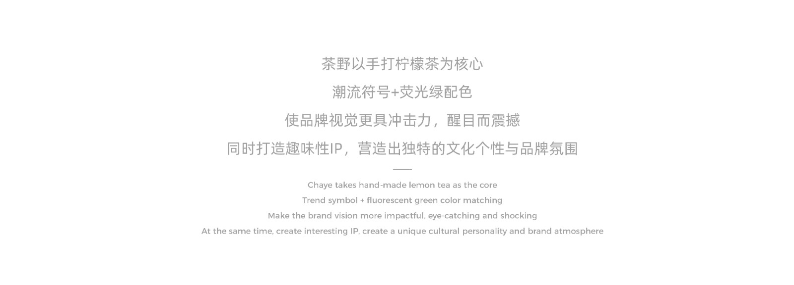茶野以手打柠檬茶为核心,潮流符号+荧光绿配色,使品牌视觉更具冲击力,醒目而震撼,同时打造趣味性IP,营造出独特的文化个性和品牌氛围